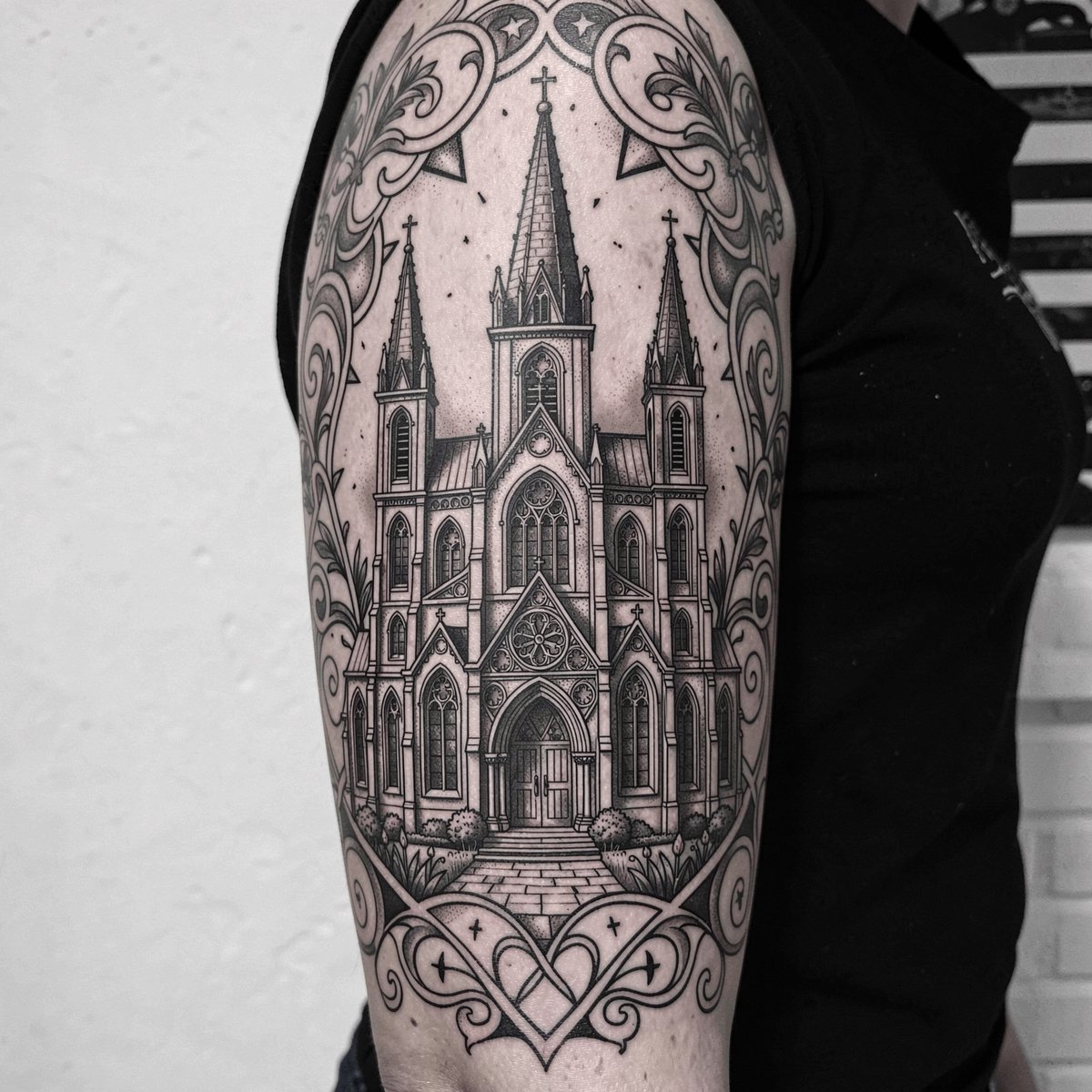 Blackwork Gothic Church Tattoo